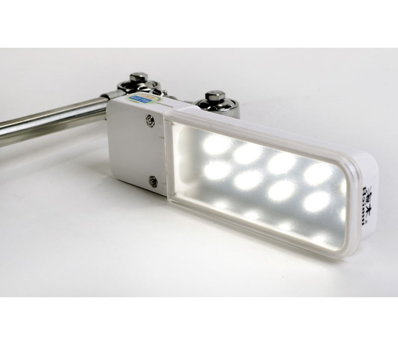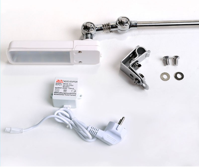 Lampka LED przeznaczona do maszyn szwalniczych. Wyposażona w krótkie ramię oraz uchwyty montażowe umożliwiające zamocowanie lampki bezpośrednio na głowicy maszyny (maszyna musi posiadać specjalny otwór montażowy w tylnej części korpusu).