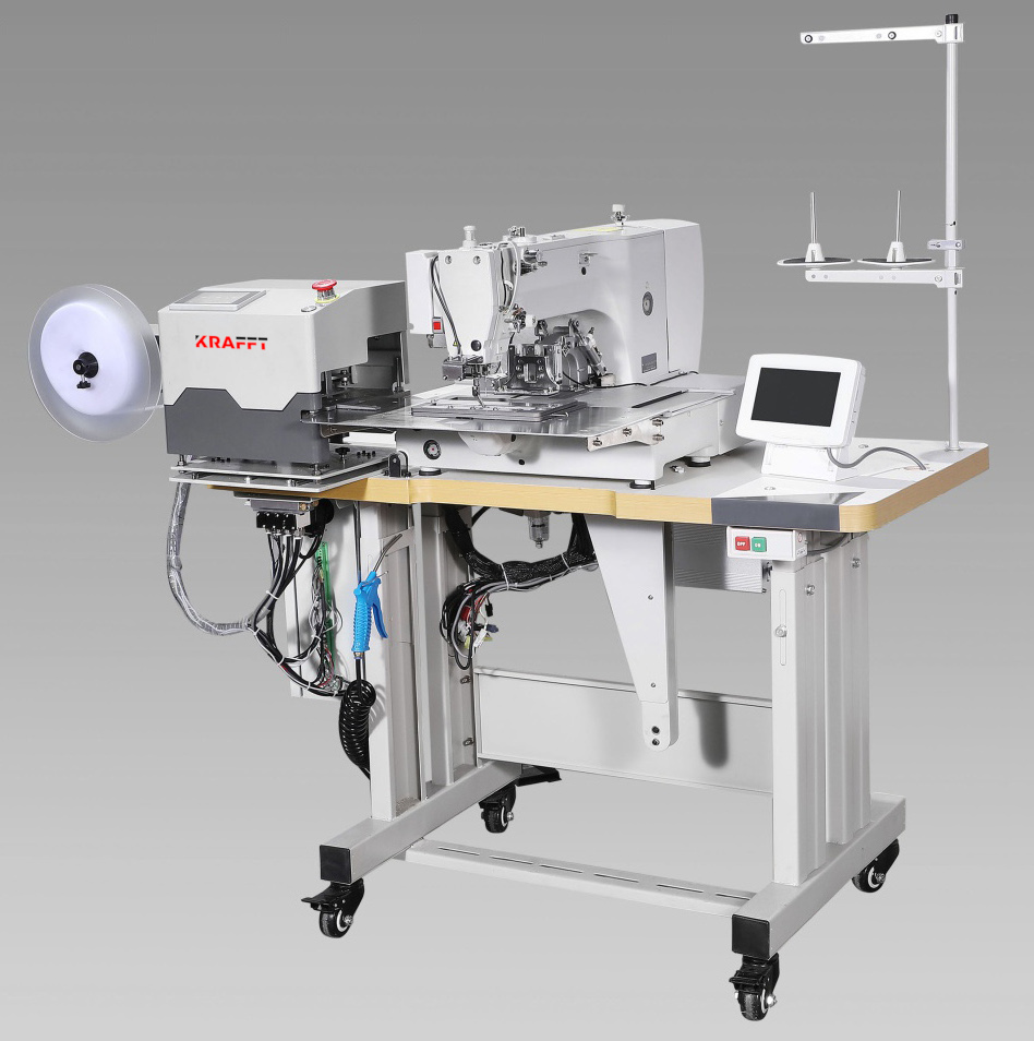 Najnowszy model specjalistycznego automatu szwalniczego przeznaczonego do naszywania rzepów i taśm. Maszyna wyposażona w automatyczny podajnik obcinający taśmę na odpowiednią długość, a następnie samoczynnie wprowadzający element w prowadnice w strefie szycia. Taśma podawana jest bezpośrednio z rolki, bez konieczności wcześniejszego cięcia taśmy na odcinki, co znacznie skraca czas całego procesu.