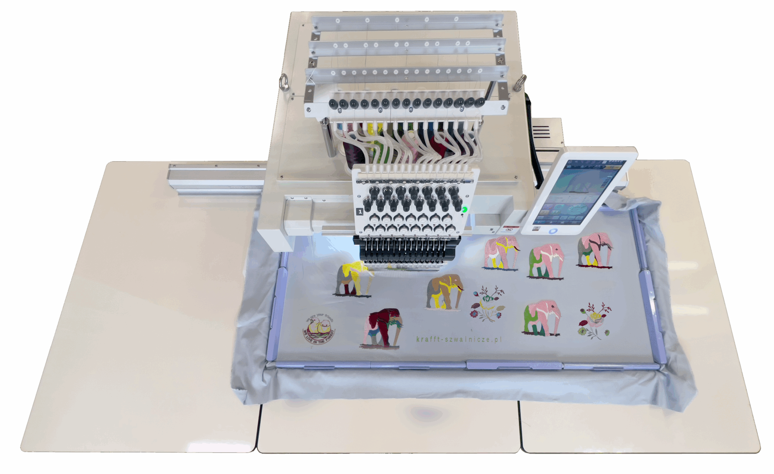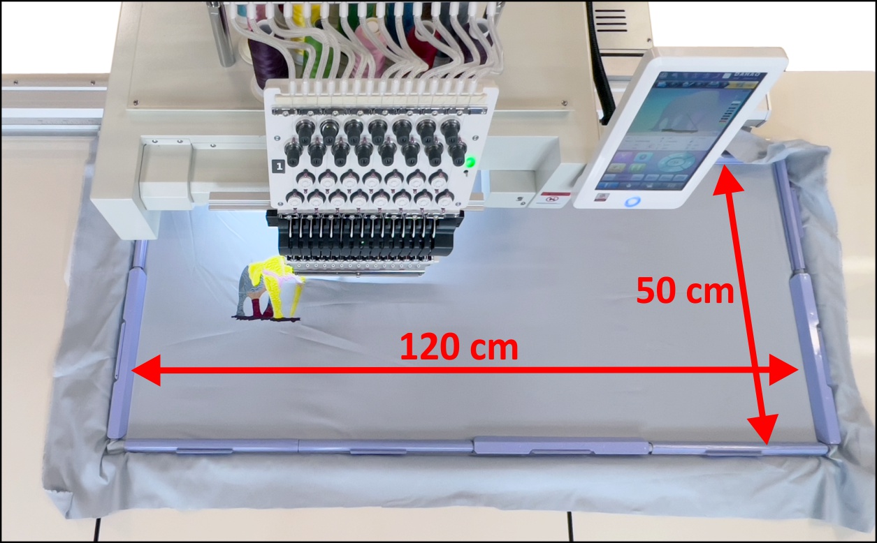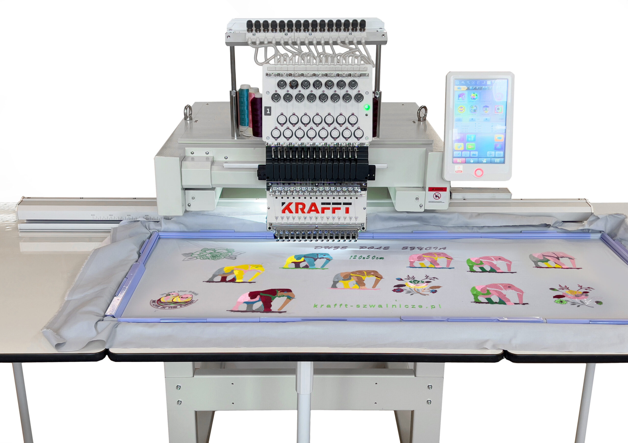Profesjonalna wielkoformatowa hafciarka 1-głowicowa 15-kolorowa przeznaczona do haftowania na elementach płaskich oraz cylindrycznych (czapki, itp.), a także na wyrobach gotowych. Maksymalne pole haftu na elementach płaskich to 50 x 120 cm. Automatyczny start i zmiana koloru.