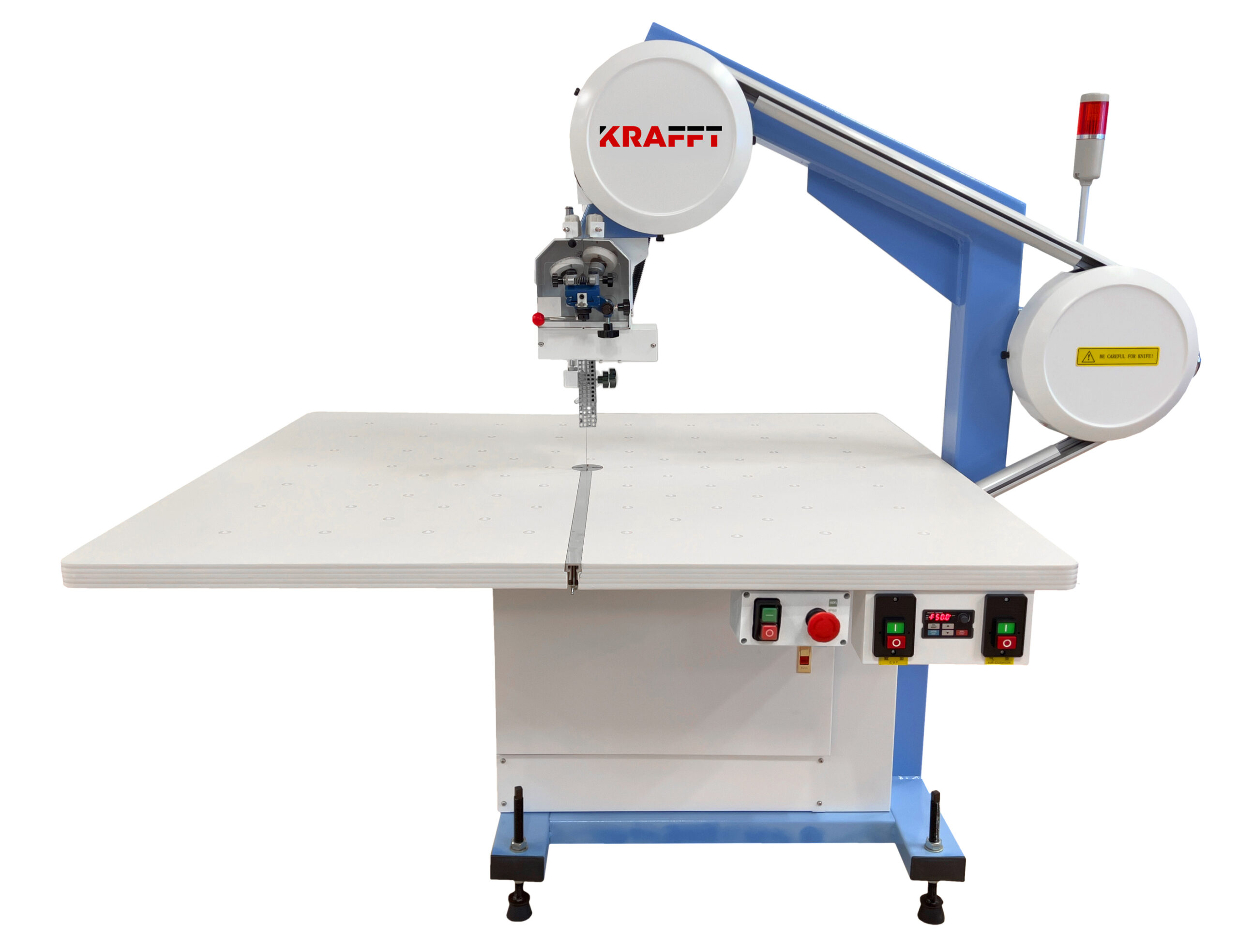 Wysokiej jakości nóż taśmowy, przeznaczony do precyzyjnego wykrawania elementów z wielowarstwowych nakładów, w różnych rodzajach materiałów, np. : dzianin, tkanin, materiałów technicznych. Odległość taśmy tnącej od korpusu 900 mm, największa grubość krojenia 180 mm.