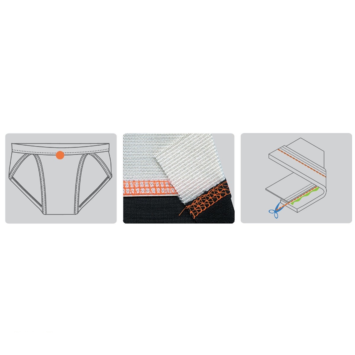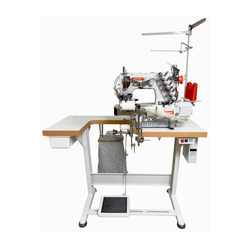 Specjalistyczna maszyna drabinkowa, przeznaczona do doszywania gumy w bieliźnie w obwodzie zamkniętym, szwem na zakładkę (slipy, bokserki, topy i inne). Maszyna wyposażona jest w prawy nóż wyrównujący krawędź materiału oraz system odsysania odciętych skrawków.