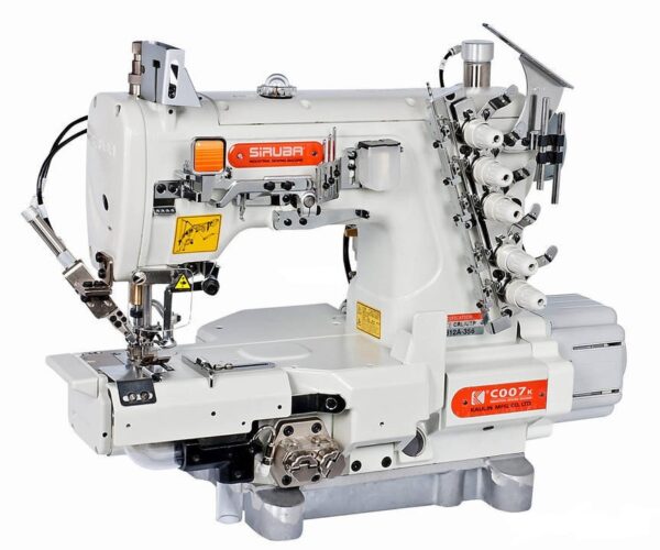 Specjalistyczna drabinkowa maszyna cylindryczna, przeznaczona do podwijania dołów lub rękawków w odzieży sportowej (podkoszulki T-Shirt itp.) wyposażona w lewy nóż odkrawający nadmiar podwiniętego materiału. Ścieg 2 lub - igłowy z górnym przeplotem lub bez. System odsysania resztek odkrojonego materiału.
