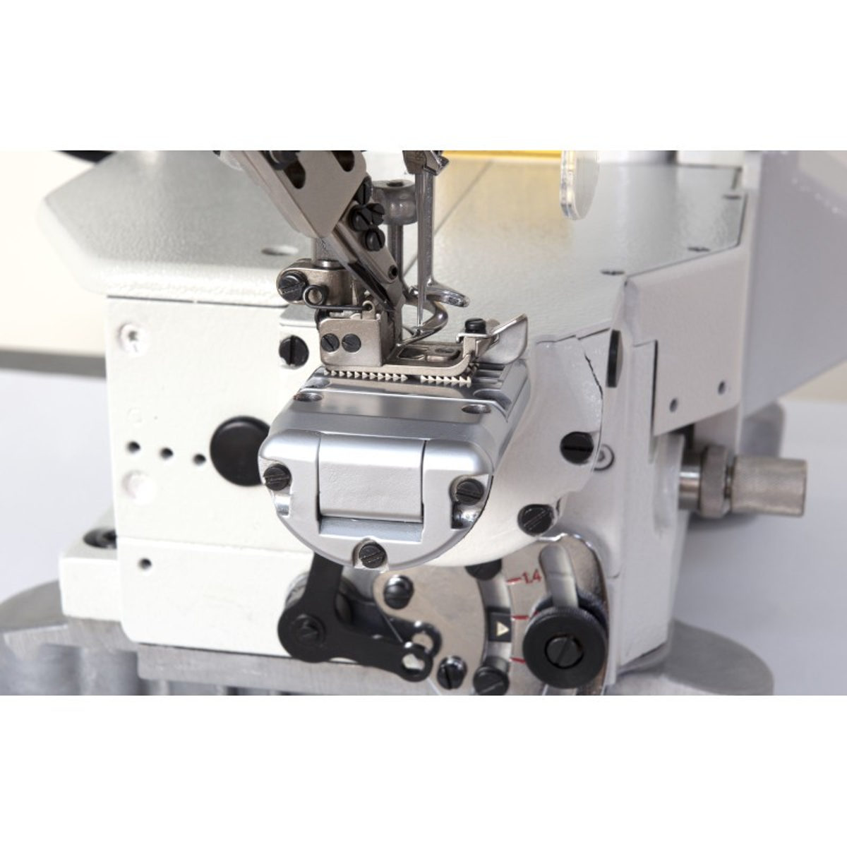 Uniwersalna maszyna drabinkowa 3-igłowa z bardzo wąskim łożem cylindrycznym - obwód cylindra to tylko 128 mm. Przeznaczona do produkcji odzieży dziecięcej i sportowej gdzie często występują elementy o małym obwodzie tj. rękawki, nogawki itp.