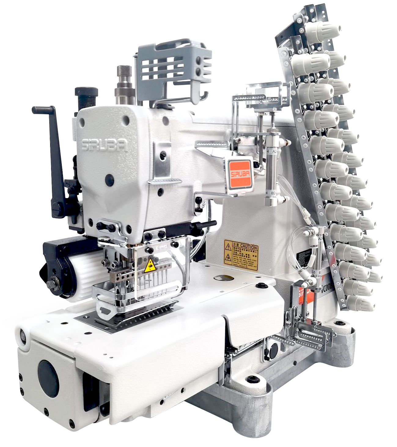 Maszyna łańcuszkowa - gumiarka 12-igłowa, 24-nitkowa, z automatycznym pneumatycznym obcinaniem nici oraz podnoszeniem stopki. Wyposażona w tylny puller wspomagający odbiór przeszywanych materiałów. Możliwe dostosowanie maszyny do różnych zastosowań. Cylindryczna konstrukcja łoża maszyny pozwala na obszywanie elementów w zamkniętych obwodach.