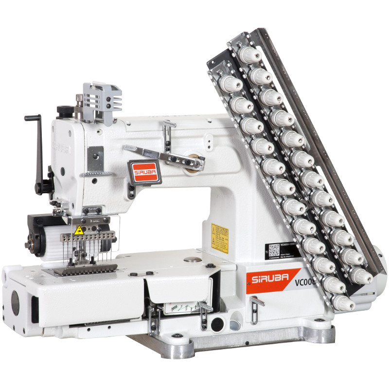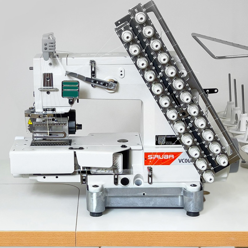 Uniwersalna maszyna łańcuszkowa 12-igłowa, 24-nitkowa, wyposażona w tylny ząbkowany puller rolkowy wspomagający odbiór przeszywanych materiałów. Łoże cylindryczne umożliwia obszywanie zamkniętych obwodów (np. w pasie spodni).