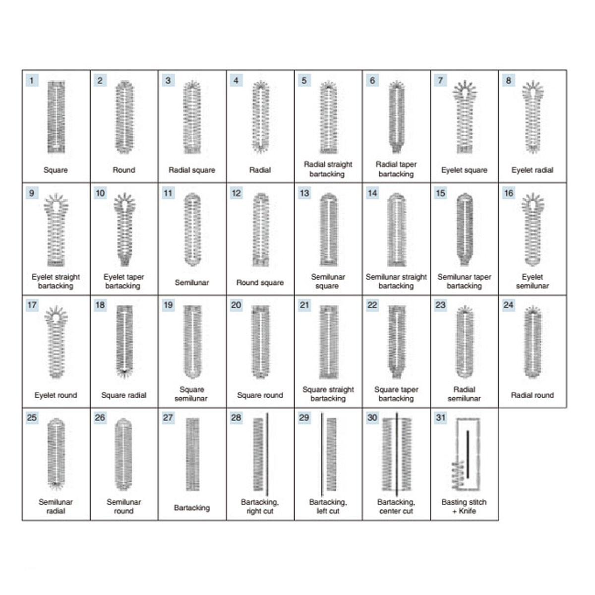 Sterowana elektronicznie dziurkarka bieliźniana, wyposażona w silnik servo wbudowany w główkę maszyny, łącząca wysoką produktywność z idealną jakością szwu. Jest to maszyna 2-nitkowa, szyjąca ściegiem stębnowym, prędkość szycia do 4200 ściegów/min. Silniki krokowe, sterują oddzielnie poszczególnymi mechanizmami maszyny. W standardowej konfiguracji maszyna dostarczana jest z już zaprogramowanymi 31 wzorami odszyć dziurek, plus dodatkowo istnieje możliwość zapisania aż 99 dodatkowych wzorów. Wzór dziurki, jak i wiele innych informacji – numer wzoru, kształty szwów, itd. – wprowadza się poprzez czytelny wielofunkcyjny panel operacyjny z graficznym wyświetlaczem. Panel posiada dodatkowo złącze USB do którego można podłączyć pamięć przenośną lub czytnik kart pamięci (umożliwia wczytywanie dodatkowych wzorów). Dziurkarka standardowo wyposażona jest w energooszczędne oświetlenie LED pola pracy.