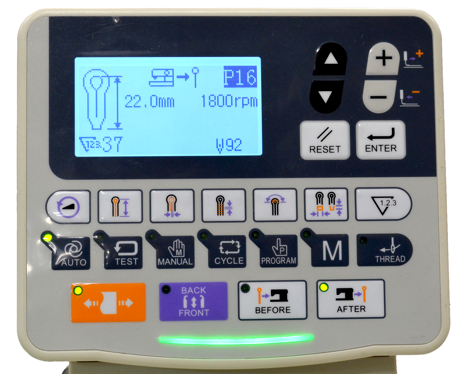 Najważniejsze parametry m.in. rodzaj i rozmiar odszycia dziurki, sposób cięcia, prędkość szycia, programowane są za pomocą nowoczesnego, czytelnego panelu sterowania. Dla każdego rodzaju dziurki możliwe jest indywidualne zaprogramowanie kształtu, szerokości, rodzaju cięcia itp.
