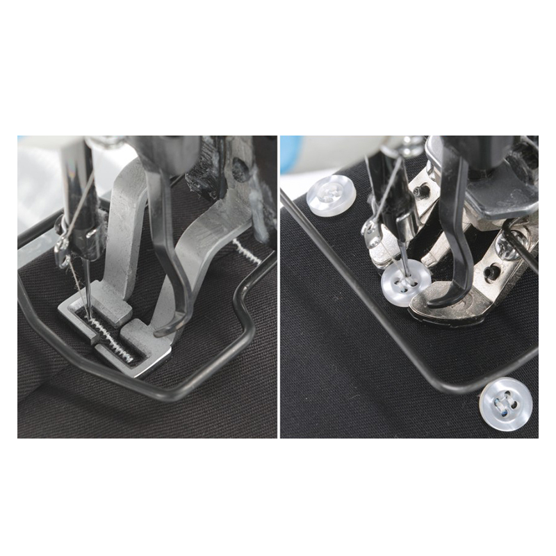 Maszyna wyposażona w zestaw części umożliwiających doszywanie guzików (regulowany uchwyt trzymający guziki, naprężacz, półeczka na guziki).