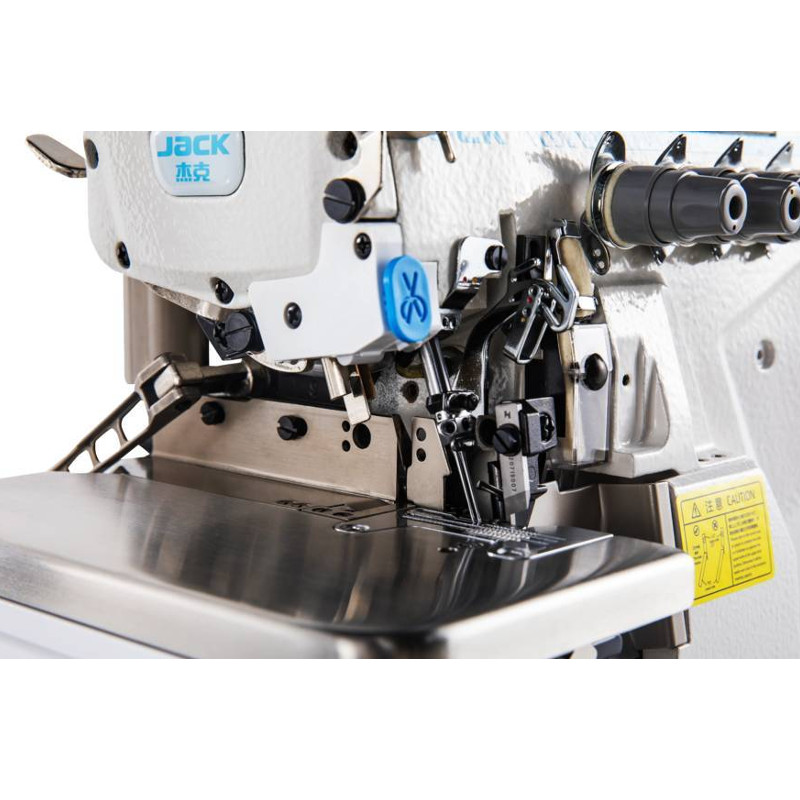Overlock 4-nitkowy wyposażony w automatyczne obcinanie łańcuszka. Wbudowany w głowicę energooszczędny silnik servo z funkcją pozycjonowania igieł oraz regulacją prędkości szycia. Takie rozwiązanie gwarantuje cichą i niezawodną pracę oraz mniejsze zużycie energii elektrycznej. W porównaniu do starszej generacji maszyn z silnikami sprzęgłowymi owerlok JACK zużywa nawet do 75% mniej prądu.