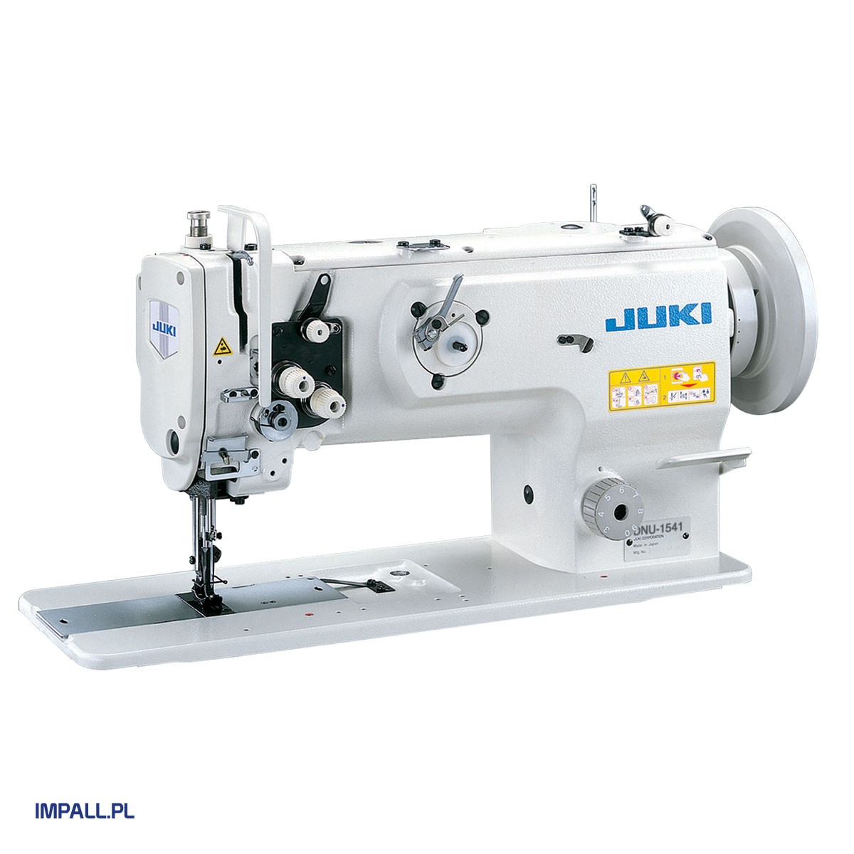 JUKI DNU – 1541 to stebnówka 1-igłowa z potrójnym transportem i pionowym chwytaczem o powiększonej pojemności dzięki czemu możliwe jest nawinięcie na szpuleczkę większej ilości nici. Jest to szczególnie przydatne przy szyciu grubą nitką. Przeznaczona do szycia materiałów ciężkich takich jak skóra, tkaniny tapicerskie, drelich, jeans, wełna, materiały techniczne itp.
